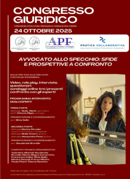è con piacere che APF Vi invita al convegno “Avvocato allo specchio: sfide e prospettive a confronto”, che si terrà in occasione del Congresso giuridico della Fondazione Avvocatura Trevigiana e del Consiglio dell’Ordine il 24 ottobre 2025, dalle ore 9.00 alle ore 13.00 (con pausa intermedia), presso l’Auditorium della sede della Provincia di[...]